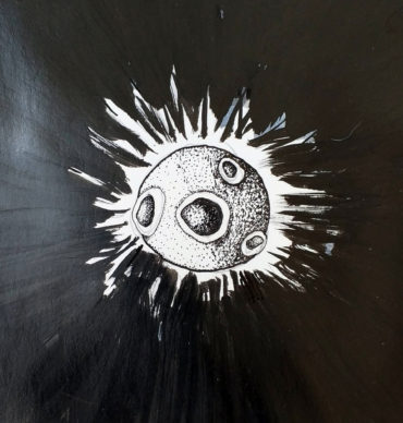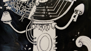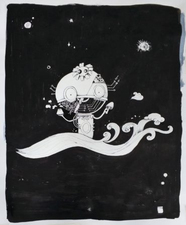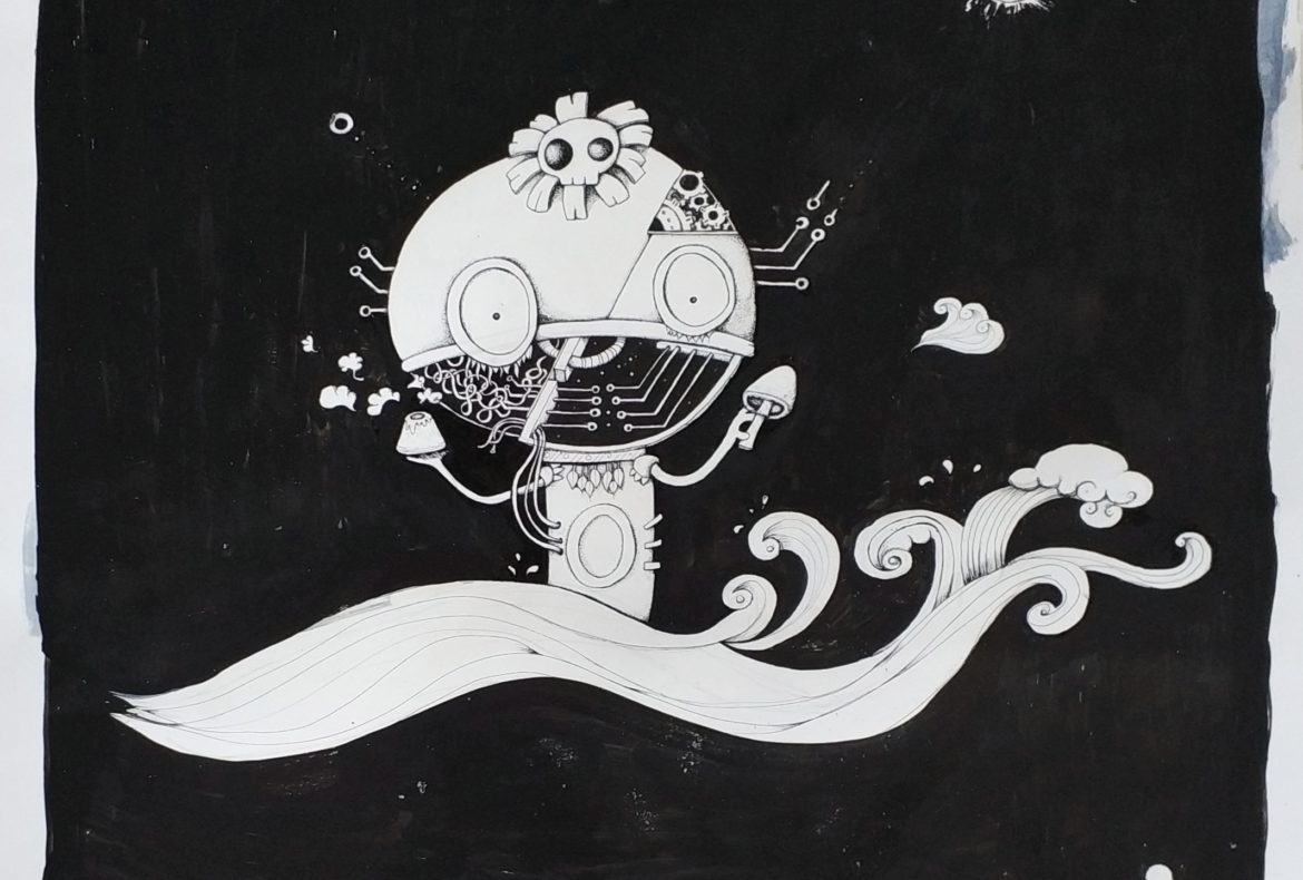 Cyborg Goddess #1 – Hallucination First Cyborg Goddess. She floats over water in outer space and holds a volcano and a magic mushroom, facing her back to planet earth Date: June 2018 Place: Barcelona Dimensions: 100 x 70 cm + + + + + + +