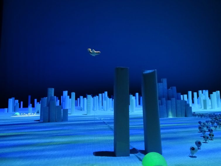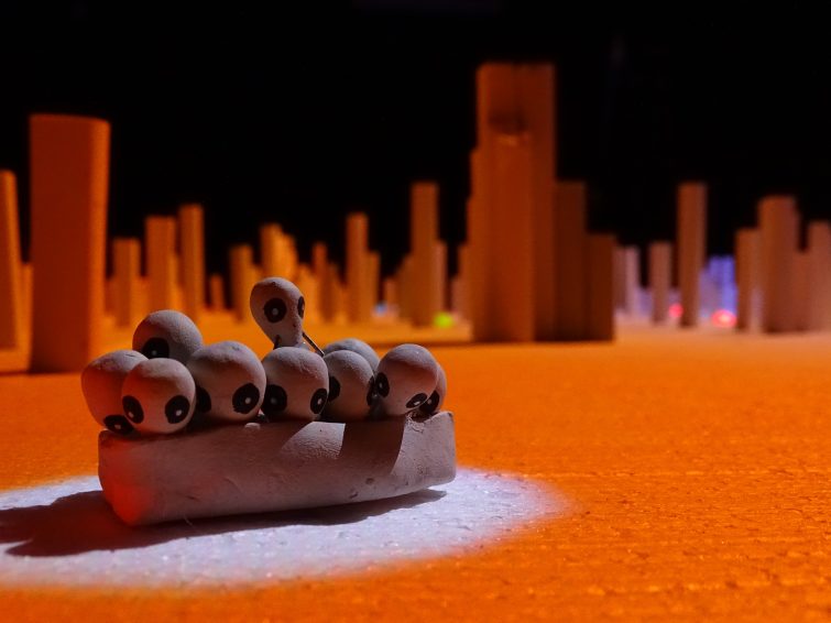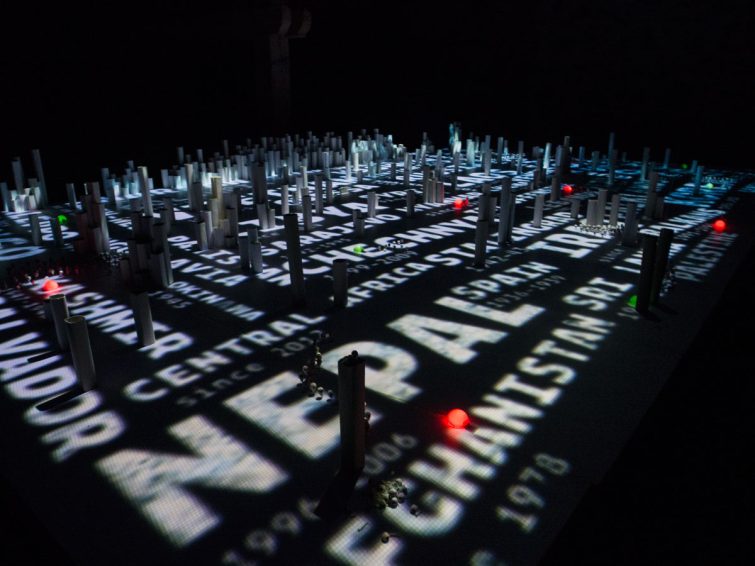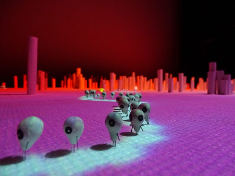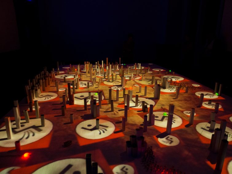 6º below nothing is an immersive and interactive object-video-installation, using video projectors, shadows, sensors, Arduinos, torch lights, ceramic objects, LEDs and surround sound. The center of the installation is a labyrinth city, full of historic and futurist events. With these ingredients a dystopian world is created that talks about borders, walls, new migrations and the latest geopolitical and economic changes.
