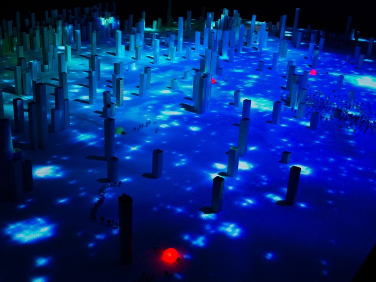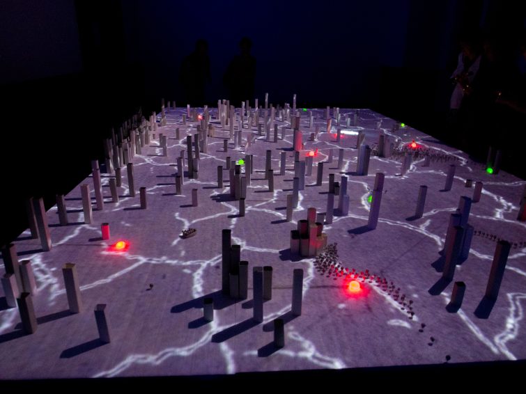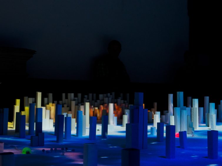 A paper city in the center of the room. A labyrinth city. Video projectors, shadows, sensors, Arduinos, torch lights, ceramic objects, LEDs and surround sound create a world that changes depending on the viewers’ actions.
