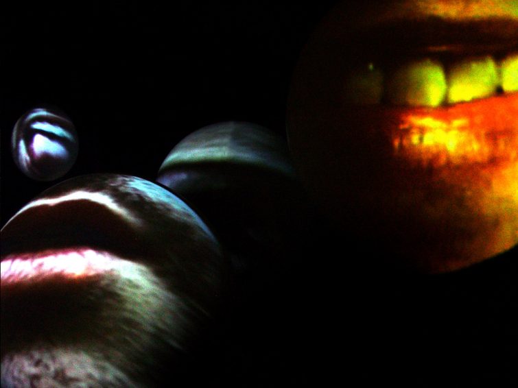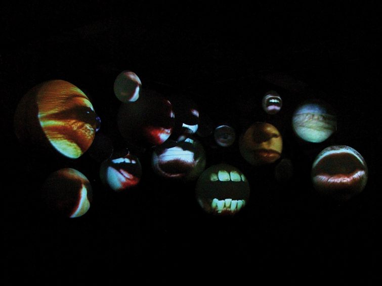 A space filled with numerous huge white balloons that surround you, gathering in a dark room. Oversized parts of human bodies are projected onto the roundly sculptured screens which deform them into bizarre fleshly mimics. Big mouths are screaming, shouting, whistling, kissing, groaning, moaning, whispering, crying, quivering. Eyes are crying, laughing, twinkling, wincing….
